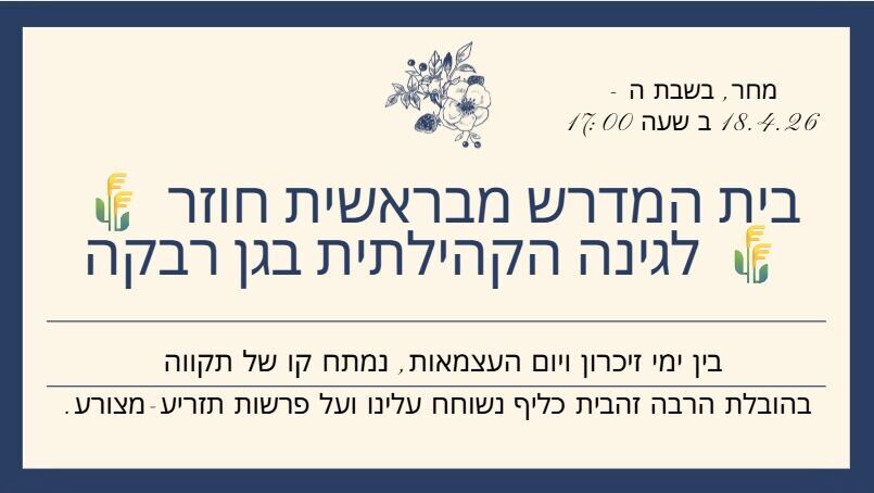 בית המדרש "מבראשית" חוזר לפעילות בגינה הקהילתית בגן רבקה בגבעתיים. המפגש הקרוב יתקיים ביום שבת, ה-18 באפריל 2026, בשעה 17:00.