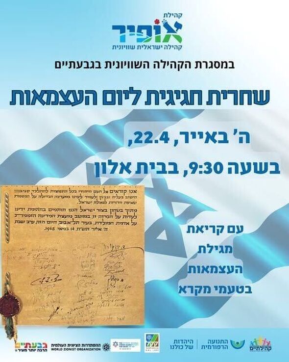 הקהילה השוויונית בגבעתיים, במסגרת קהילת אופיר, תקיים תפילת שחרית חגיגית לציון יום העצמאות ביום רביעי, 22 באפריל (ה' באייר). האירוע ייערך בבית אלון בשעה 09:30 בבוקר, בהשתתפות הרב גלעד קריב.