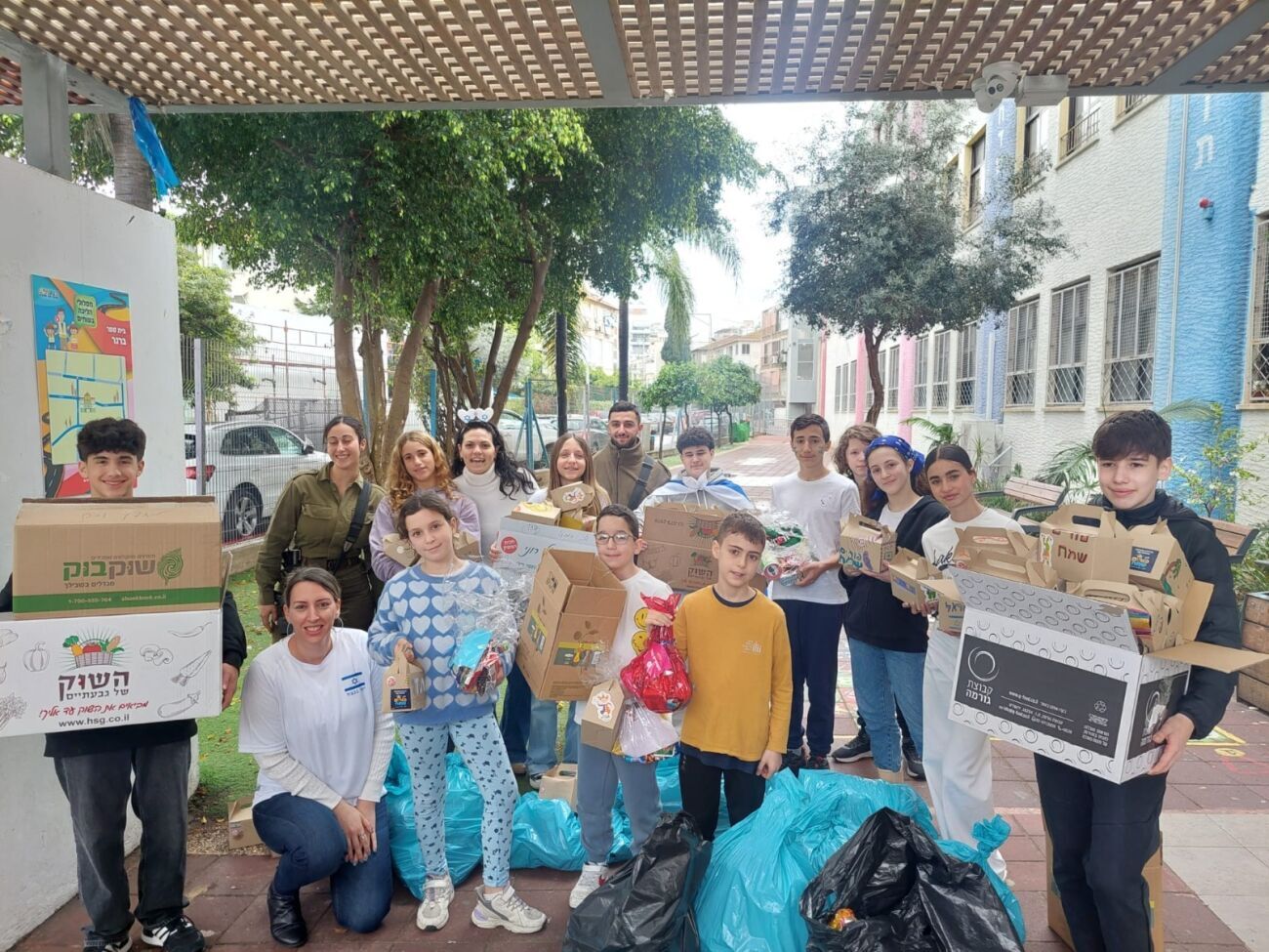 תלמידים מכל בתי הספר בעיר גבעתיים השתתפו במאמץ ואספו חבילות שי הכוללות דברי מתיקה, מוצרי היגיינה והפתעות נוספות. הם צירפו גם ברכות מרגשות ללוחמים, שהגיעו בבוקר לאסוף את המשלוחים.