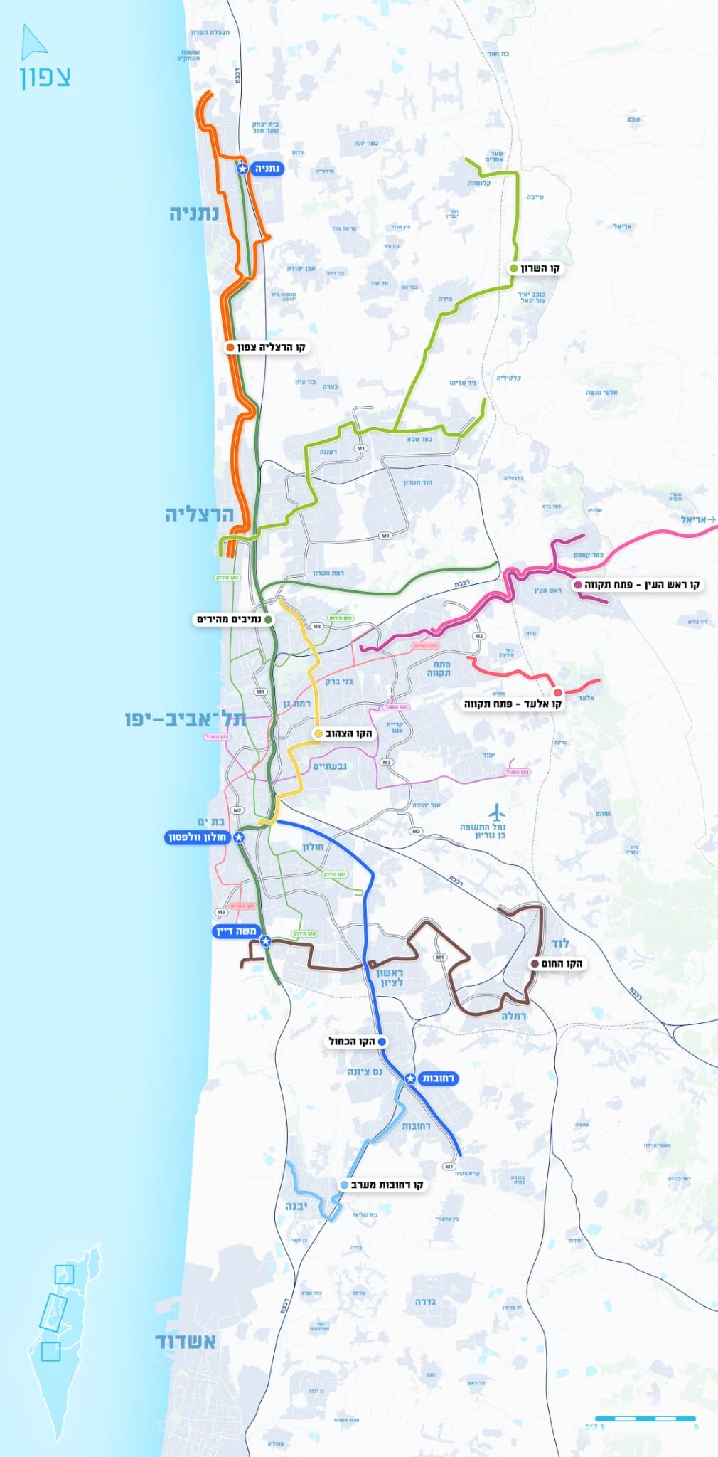 אריאל – ראש העין – אלעד – פתח תקווה: המערכת תחבר את האזור המזרחי לפתח תקווה, ולמערכת הסעת ההמונים בגוש דן, ותשתלב ברשת הקיימת והמתפתחת.