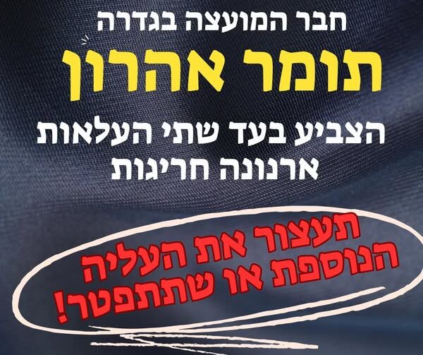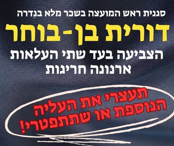 מאבק הארנונה בגדרה! מיטל קדוש קוראת לתושבים להגיע ביום ראשון 22.12 לישיבת המועצה בה יעלה לאישור תקציב המועצה ולמחות על העלאת הארנונה