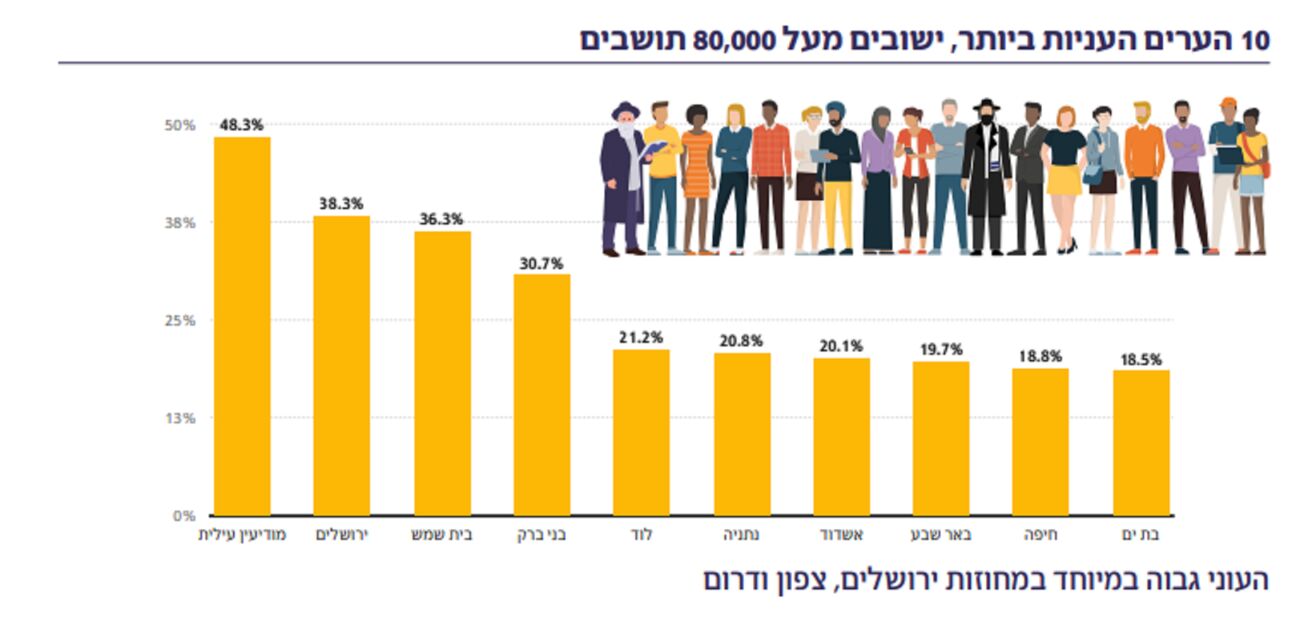 העיר הענייה ביותר (מבין היישובים בהם יותר מ80 אלף תושבים) היא מודיעין עילית, לאחר מכן נמצאות ירושלים, בית שמש, בני ברק, לוד, נתניה, אשדוד, באר שבע, חיפה ובת ים במקום העשירי.