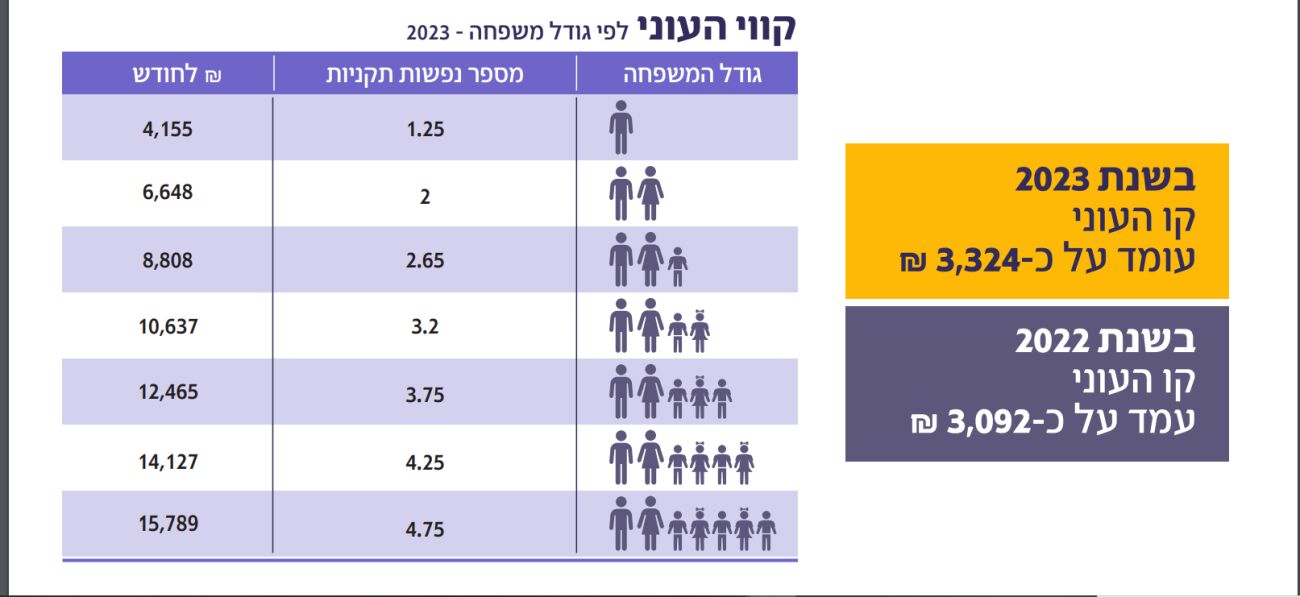 בשנת 2023 עמד קו העוני על 3,324 ש"ח ומי שהכנסותיו מתחת לסכום זה נמצא במצב של עני. קו העוני של זוג בישראל עומד על 6,648 ש"ח וקו העוני של משפחה ממוצעת בת 5 נפשות הוא 12,465 ש"ח לחודש.