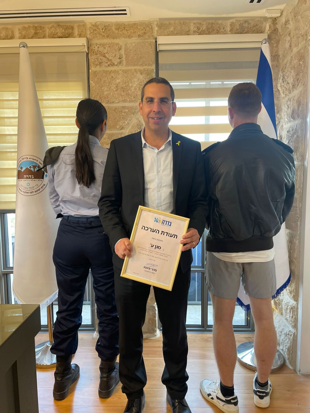 יו"ר האגודה למען החייל, יגאל גלסנר וסהר פינטו העניקו תעודת הוקרה ושי לתושבי גדרה: סגן ע' וסרן מ' שקבלו את כנפי הטיסה במסדר הכנפיים המסורתי של חיל האוויר