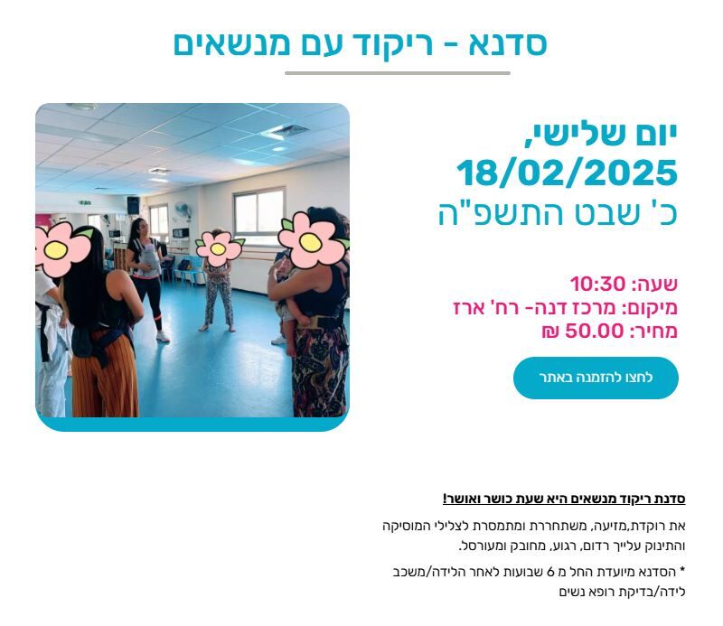יום שלישי | 18/2 | 10:30 | סדנא – ריקוד עם מנשאים | מרכז דנה – רח' ארז | כרטיסים מוזלים באתר מרכז אופק