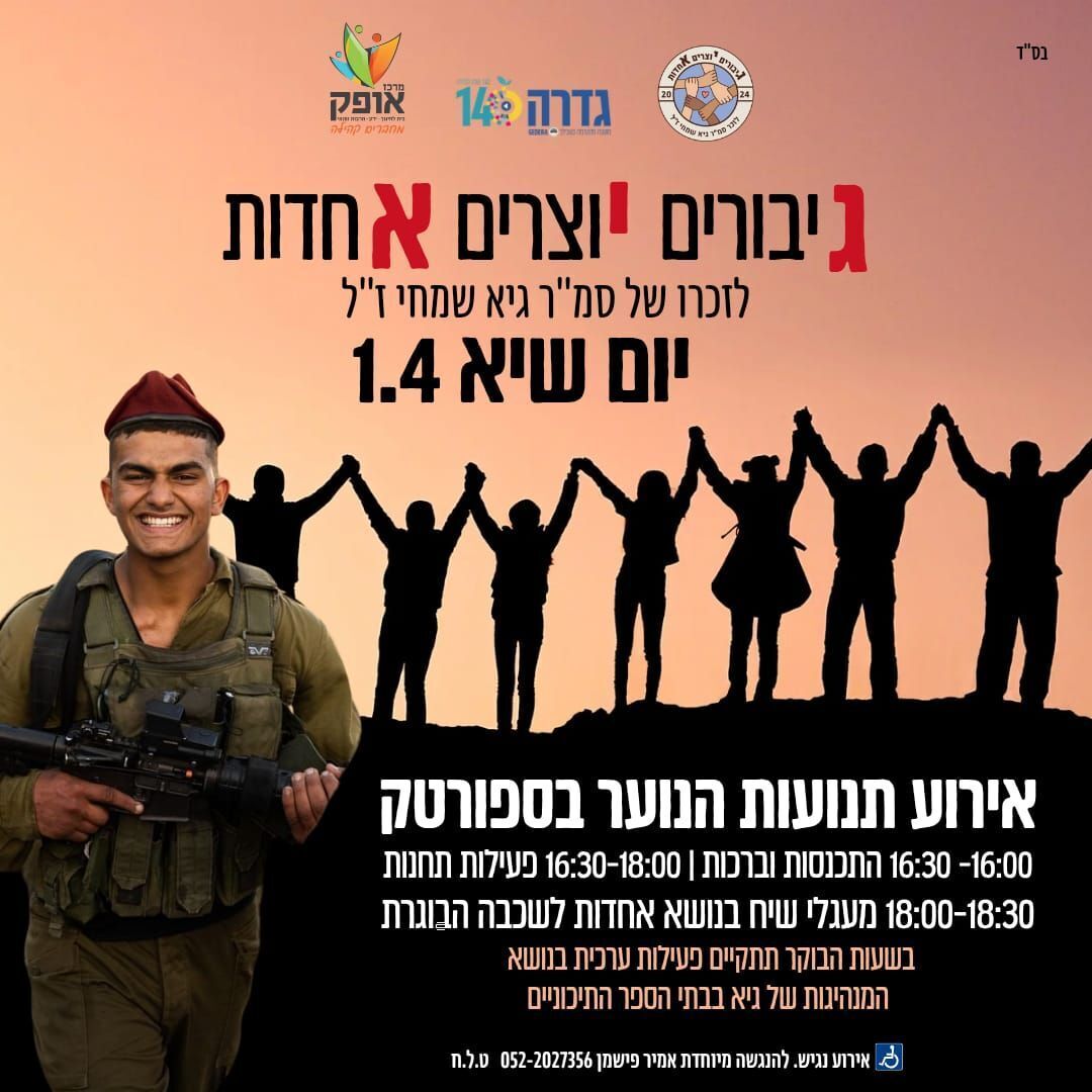 ביום שלישי, ה-1 באפריל, יתקיים בגדרה יום שיא מיוחד לזכרו של סמ"ר גיא שמחי ז"ל, תחת הכותרת "גיבורים יוצרים אחדות". האירוע, המאורגן על ידי תנועות הנוער בגדרה, יכלול מגוון פעילויות ויתקיים במרכז אופק בגדרה.