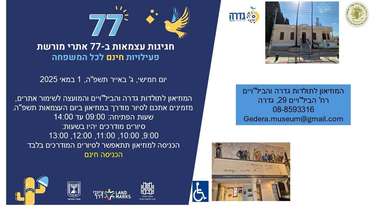 המוזיאון לתולדות גדרה והביל”ויים והמועצה לשימור אתרי מורשת בישראל מזמינים אתכם סיור מודרך במוזיאון ביום העצמאות תשפ”ה.