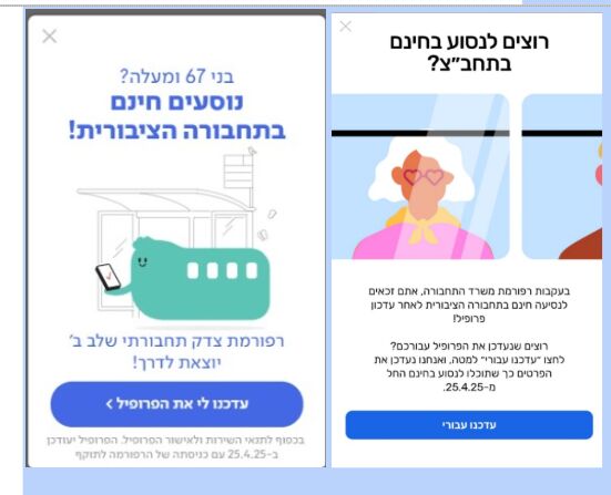 ב-25 באפריל 2025 נכנסה לתוקף הפעימה השנייה של רפורמת "צדק תחבורתי", במסגרתה הורד גיל הזכאות לנסיעות חינם בתחבורה הציבורית מ-75 ל-67. הרחבה זו צפויה להשפיע על כ-600,000 אזרחים ותיקים נוספים, המתווספים למעגל הזכאים לנסיעה חינם, ובכך מגדילה את מספרם לכ-1.1 מיליון ישראלים.