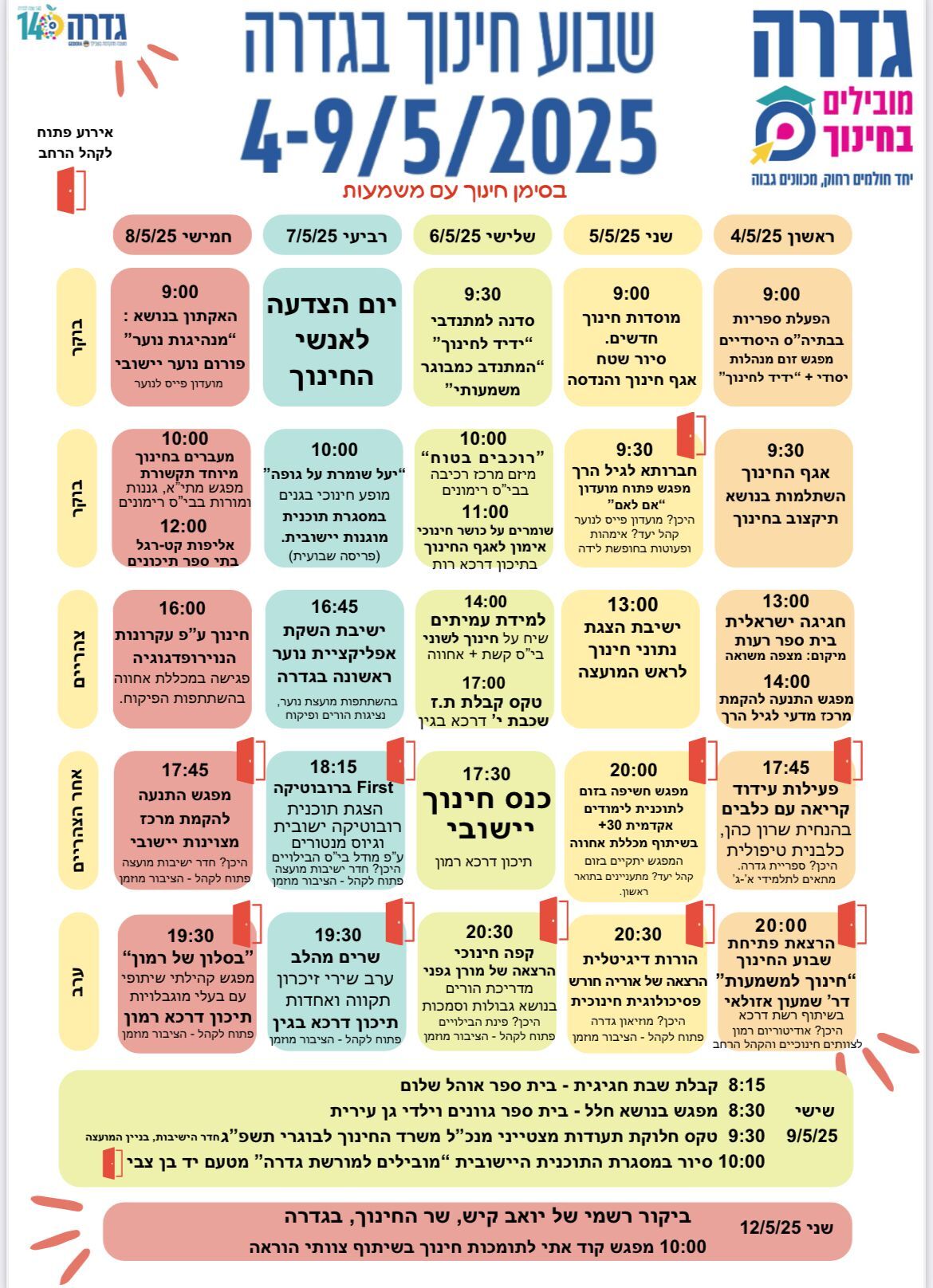 המועצה המקומית גדרה תציין בשבוע הבא את שבוע החינוך 2025 בשורת אירועים שיעלו על נס את השגי מערכות החינוך במושבה