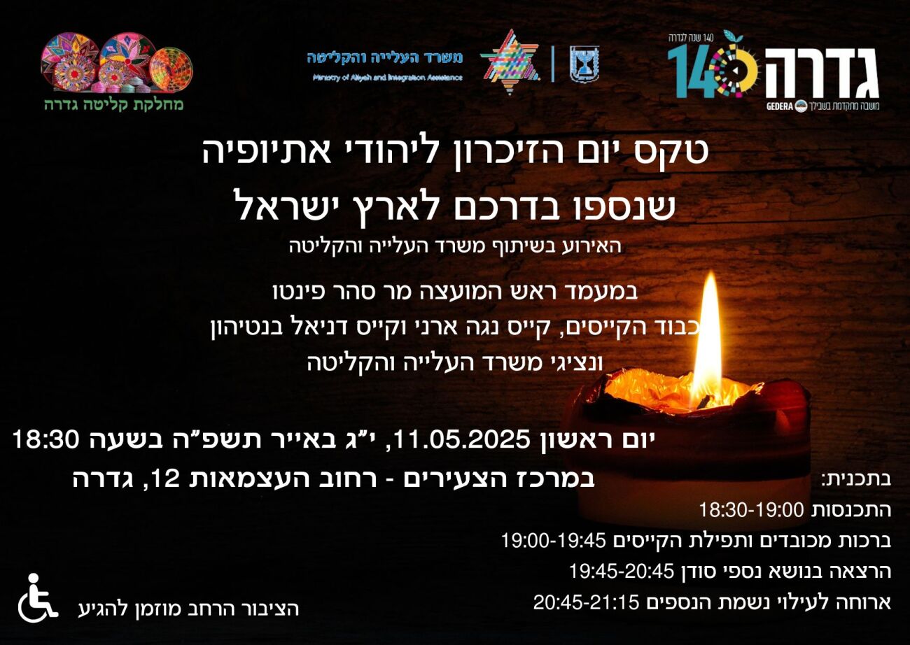 גדרה: ביום ראשון 11.5 יתקיים במרכז הצעירים, טקס הזיכרון של גדרה ליהודי אתיופיה שנספו בדרכם לארץ ישראל