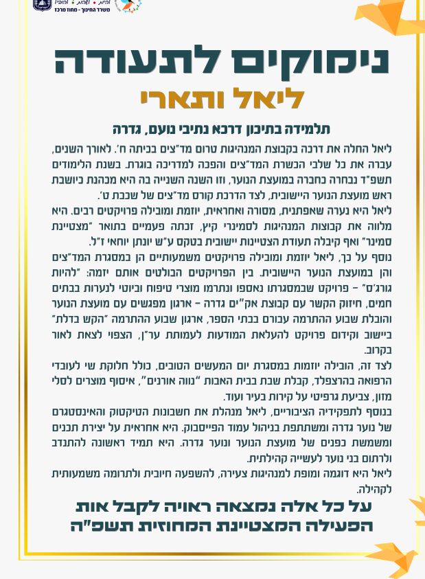 גדרה: ליאל ותארי, תלמידת נתיבי נועם קבלה את אות הפעיל המצטיין המחוזי