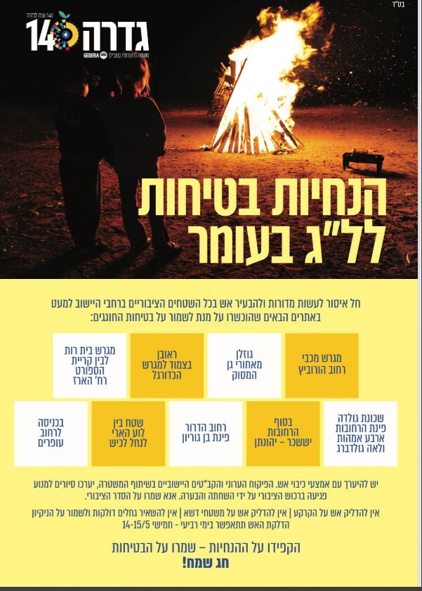 מחר (חמישי 15.5) ניתן להדליק מדורות רק ב - 9 מוקדים אותם הכשירה מועצת גדרה: מגרש מכבי, ליד גן המסוק, רחוב ראובן, בין בית הספר דרכא רות לבין קריית הספורט, בשכונת גולדה, יששכר – יהונתן, רחוב הדרור פינת בן גוריון, לוע הערי - לנחל לכיש, רחוב עופרים