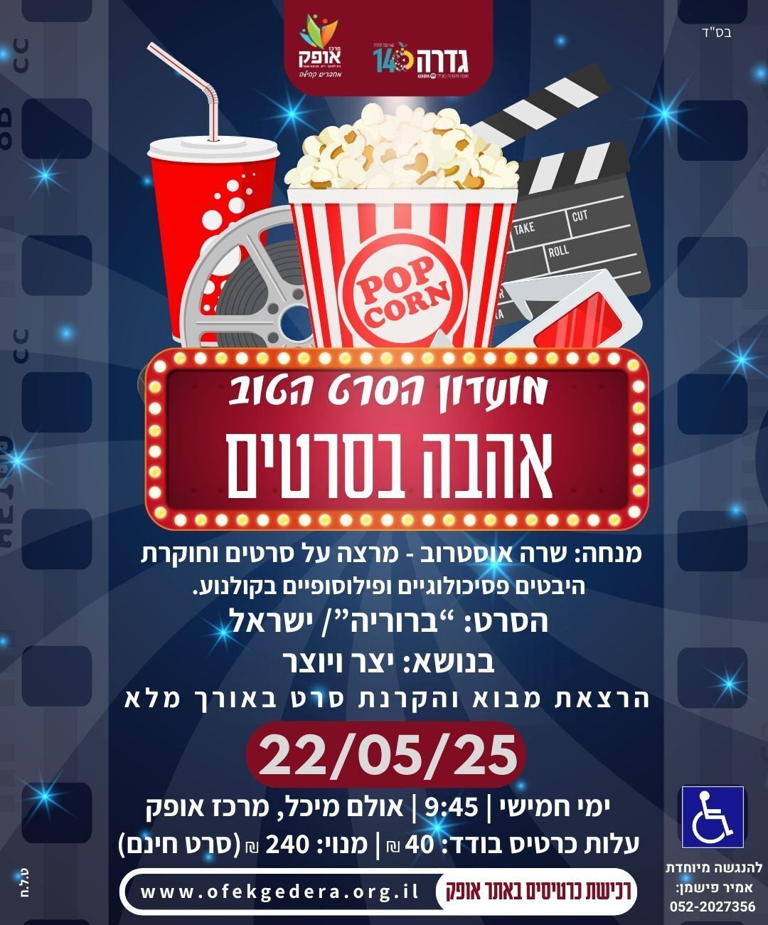 - יום חמישי, 22.5, בשעה 9:45: מועדון הסרט הטוב יקרין את הסרט "ברוריה" באולם מיכל, מרכז אופק. כרטיסים מוזלים זמינים באתר מרכז אופק.