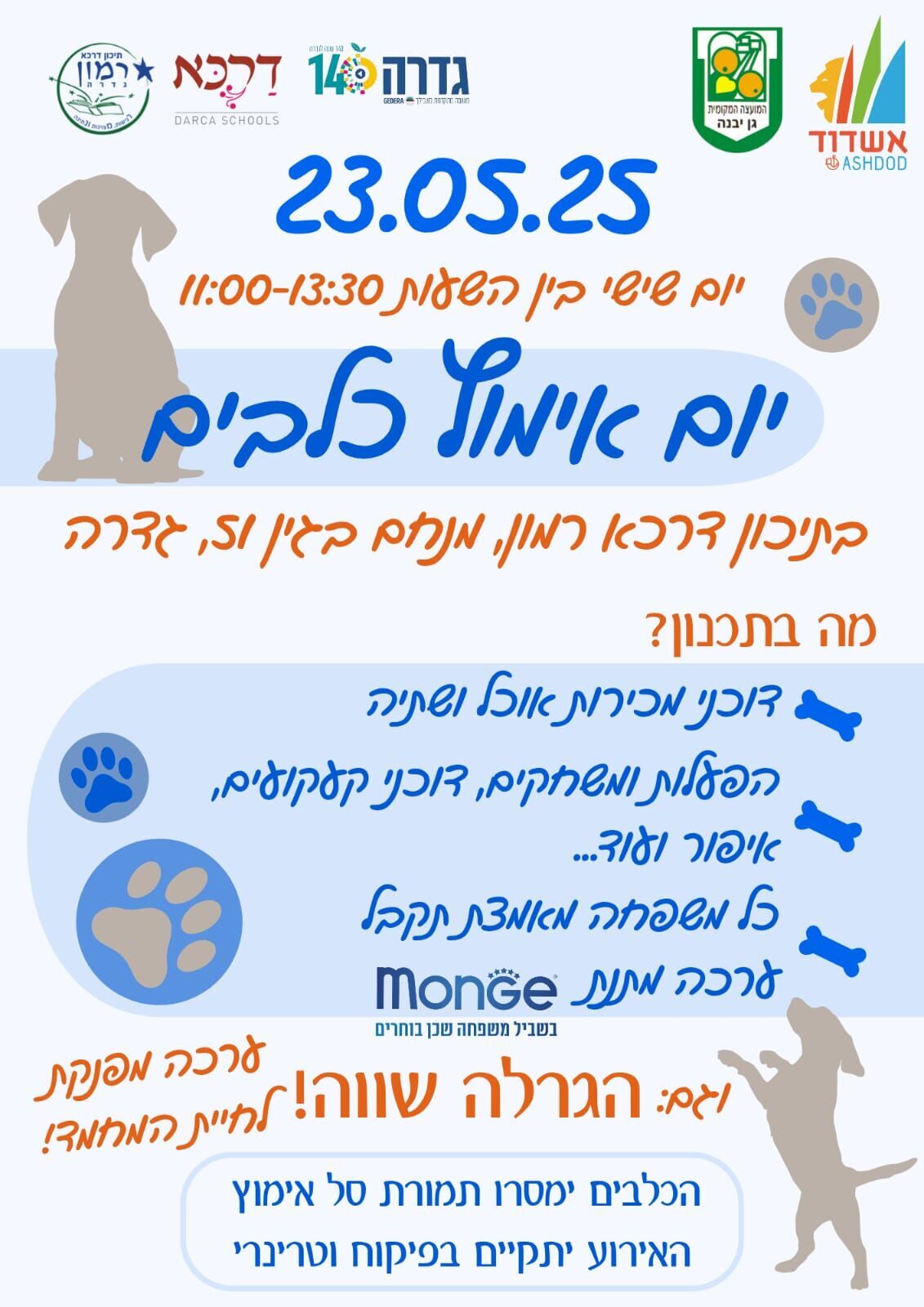 - יום שישי, 23.5, בשעה 11:00: יום אימוץ כלבים יתקיים בתיכון דרכא רמון. הציבור הרחב מוזמן.
