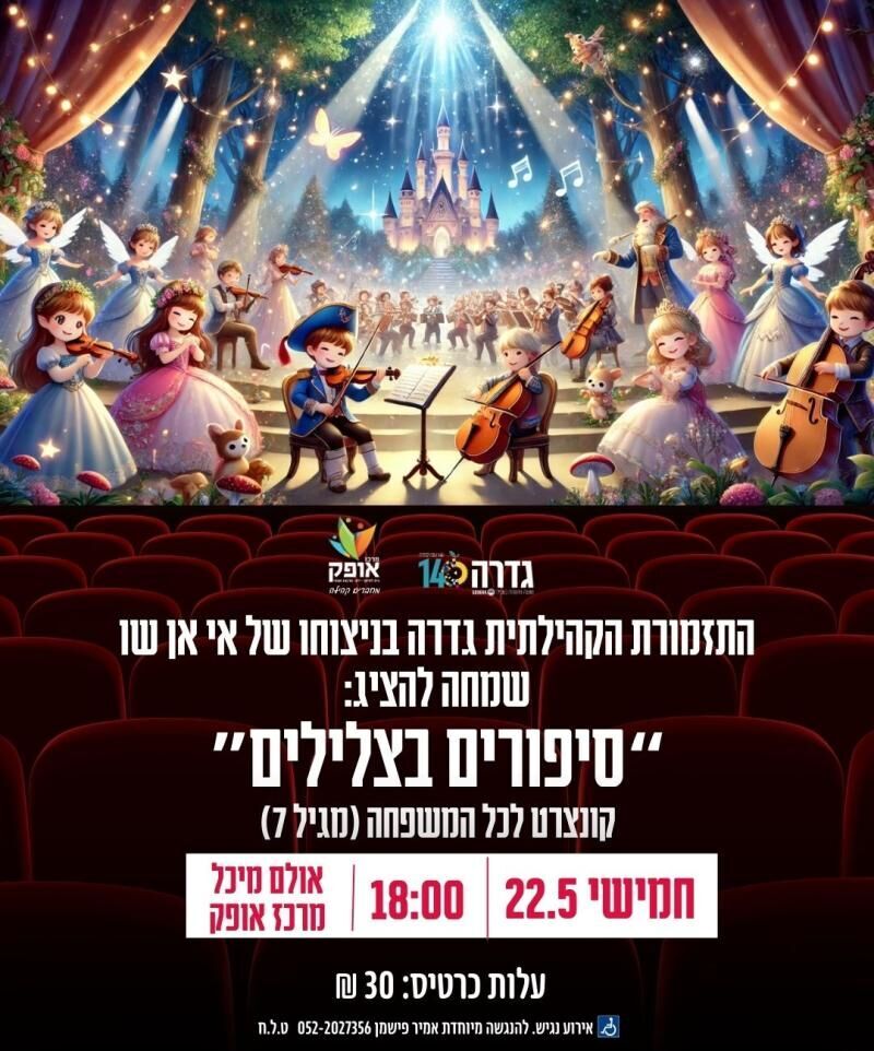 - יום חמישי, 22.5, בשעה 18:00: קונצרט לילדים "סיפורים בצלילים" בביצוע התזמורת הקהילתית גדרה בניצוחו של אי-אן שו. האירוע יתקיים באולם מיכל, מרכז אופק. כרטיסים מוזלים זמינים באתר מרכז אופק.