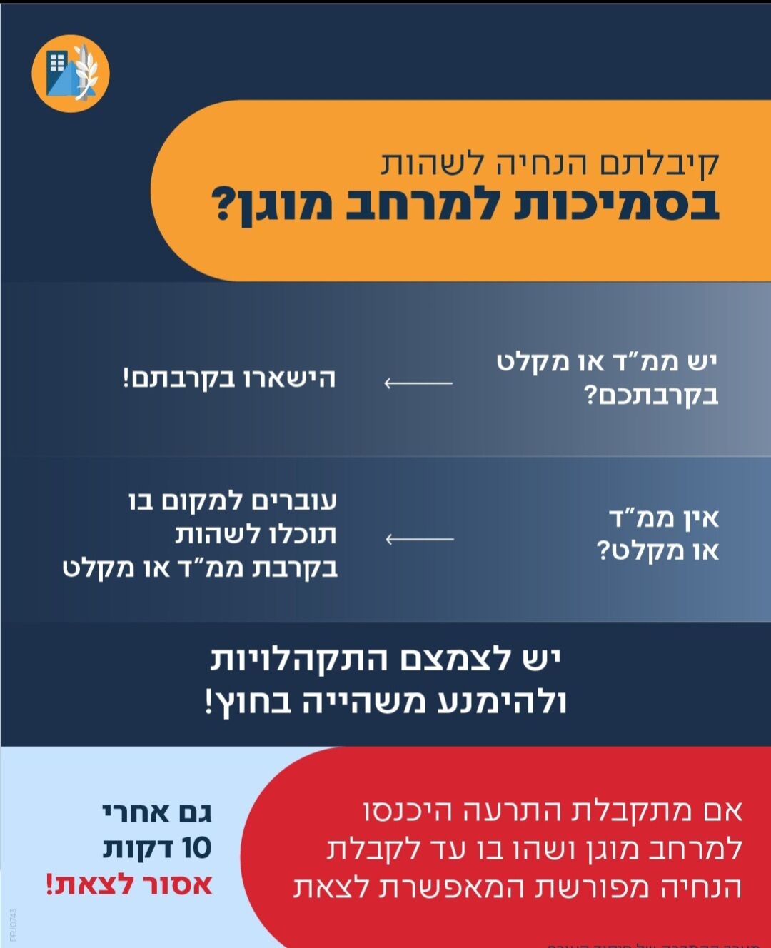 שימו לב! אזרחים הנמצאים באזורים בהם התקבלה הודעה על שהייה בסמיכות למרחבים מוגנים מתבקשים להימנע משהייה בחוץ.