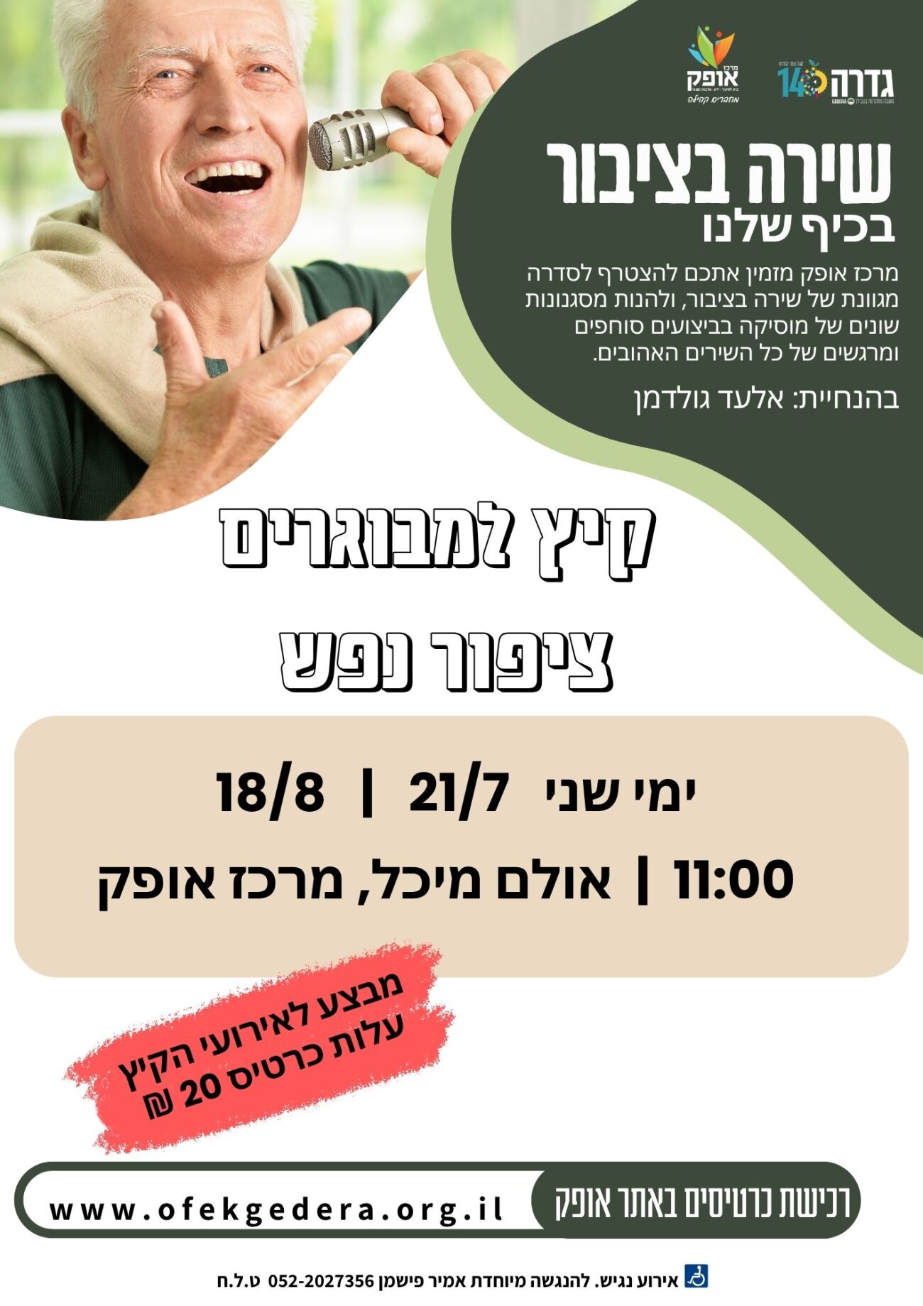 יום שני | 21.7 | 11:00 | אירועי קיץ: שירה בציבור | אולם מיכל, מרכז אופק | כרטיסים מוזלים באתר מרכז אופק