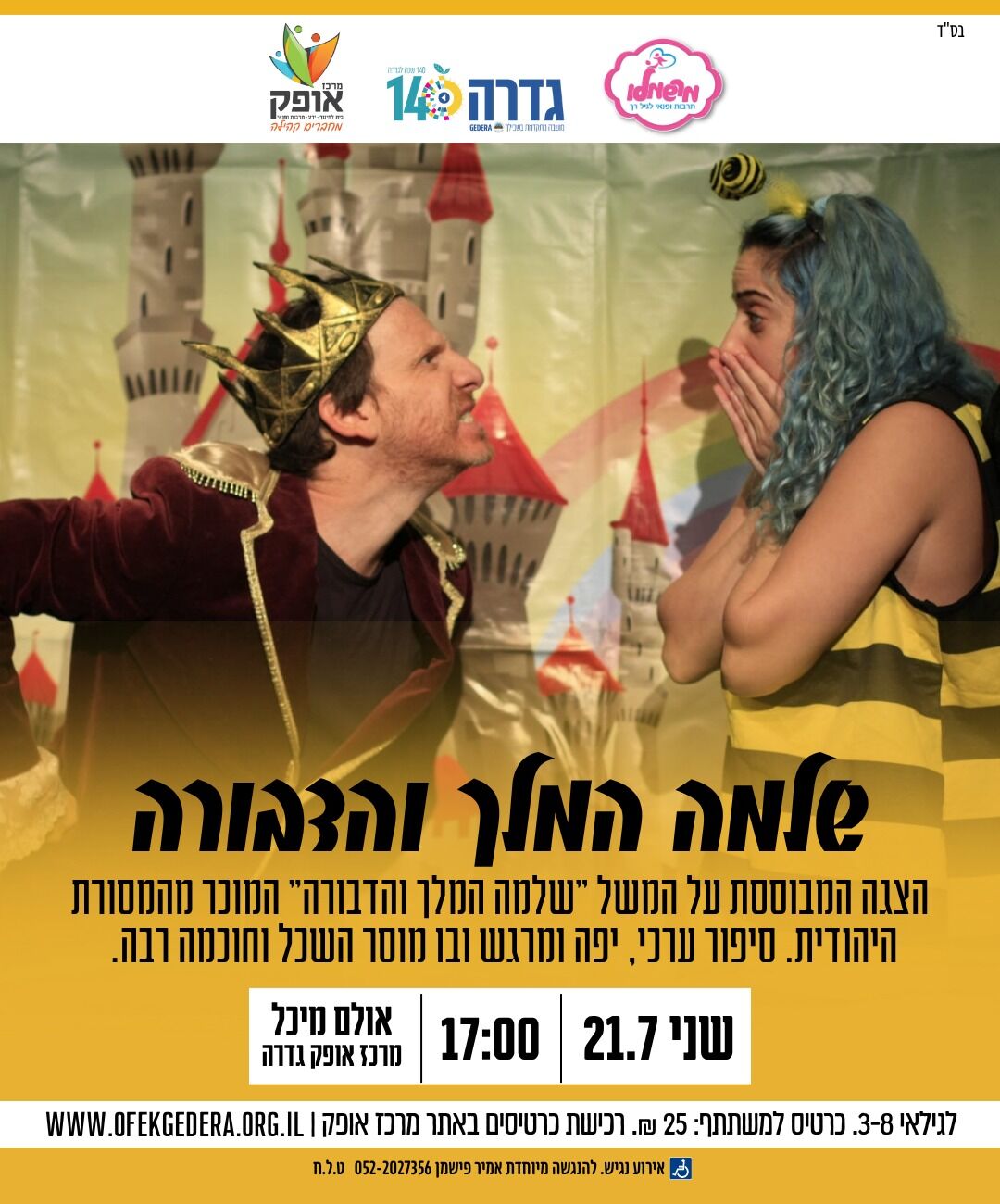יום שני | 21.7 | 17:00 | אירועי קיץ – קיץ מרשמלו: "שלמה המלך והדבורה" | אולם מיכל, מרכז אופק | מתאים לגילאי 3-8 | כרטיסים באתר מרכז אופק