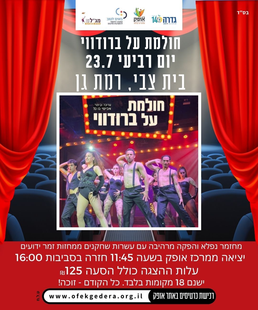 יום רביעי | 23.7 | 11:45 | הצגה "חולמת על ברודווי" | בית צבי, יציאה ממרכז אופק | כרטיסים באתר מרכז אופק