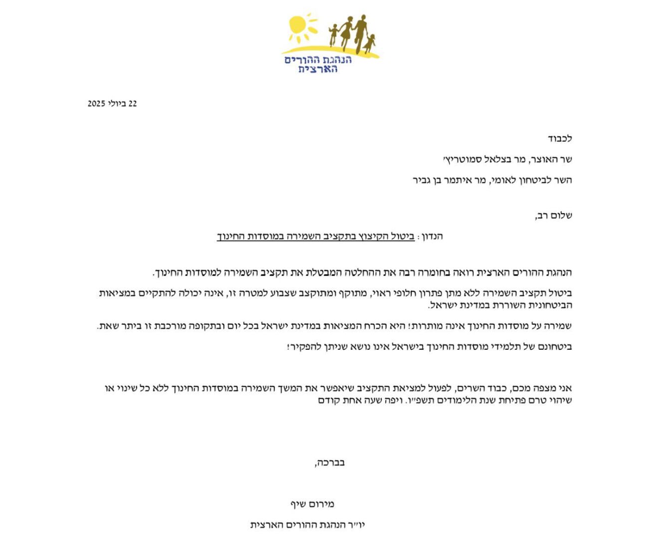 הנהגת ההורים הארצית הביעה את התנגדותה למהלך ושלחה מכתב לשרים סמוטריץ ובן גביר, בטענה כי הם רואים את ההחלטה בחומרה רבה וטענו כי ביטחונם של התלמידים אינו הפקר.