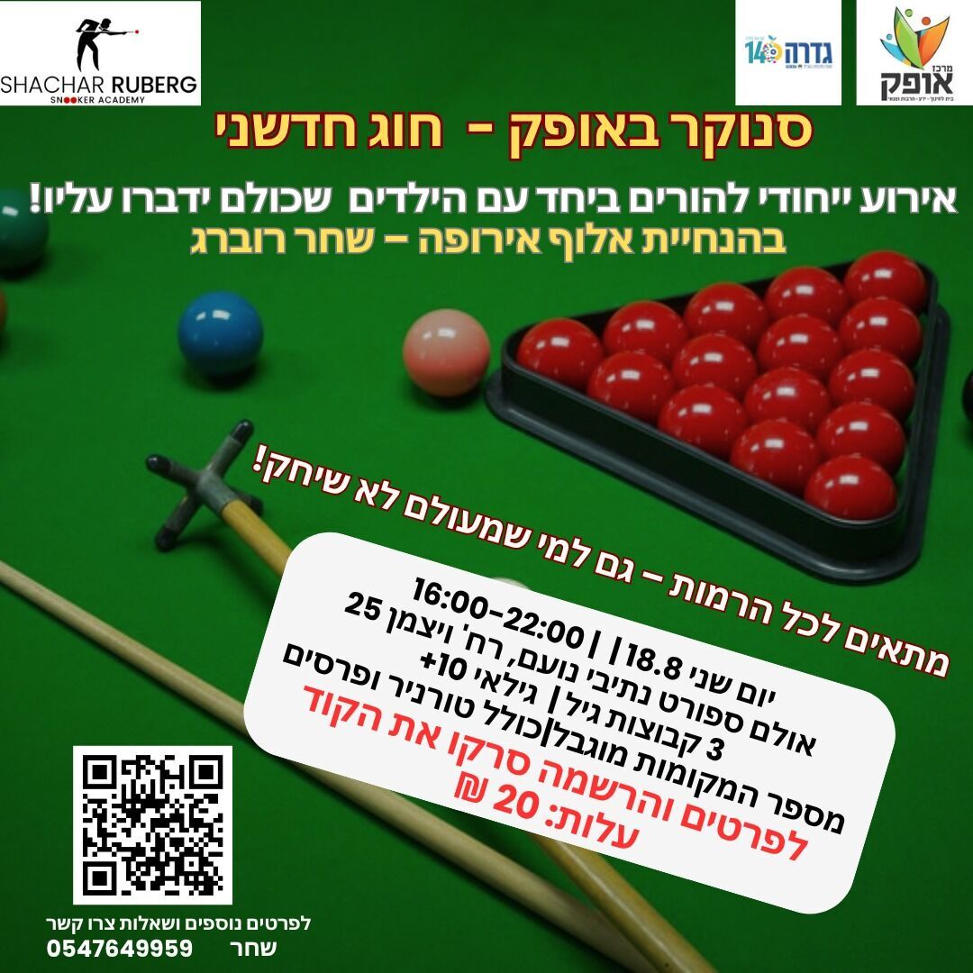 מרכז אופק גדרה יקיים אירוע סנוקר חגיגי להורים וילדים, בהנחייתו של אלוף אירופה, שחר רוברג. האירוע מיועד גם למתחילים שמעולם לא החזיקו במקל סנוקר.