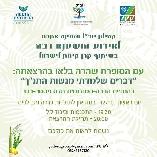 קהילת יובל גדרה, בשיתוף עם קרן קיימת לישראל, מזמינה את התושבים לאירוע מיוחד לכבוד הושענא רבה.