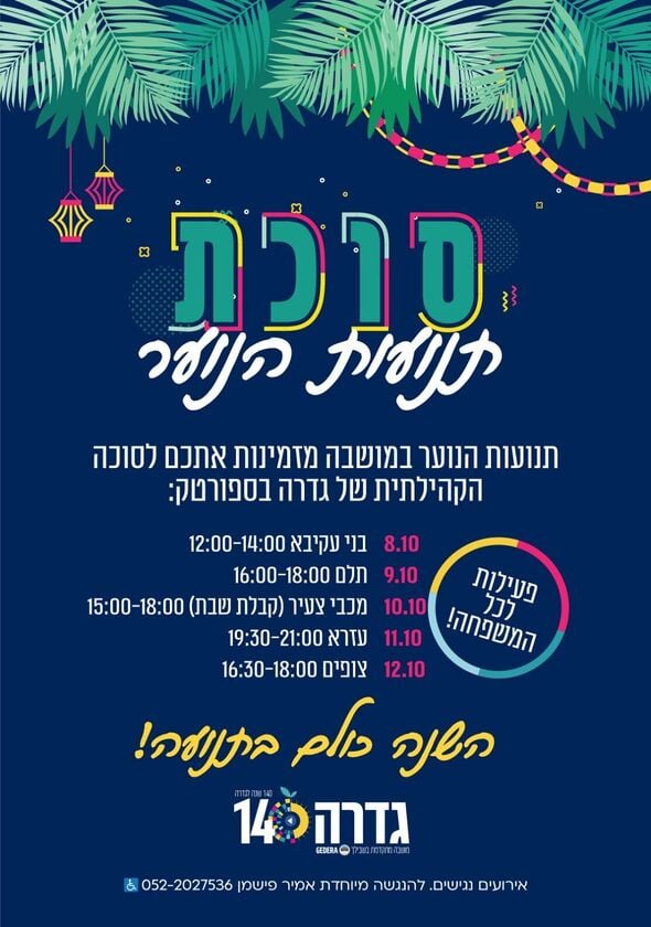 סוכת תנועות הנוער של גדרה: המועצה המקומית מזמינה את הציבור לפעילויות לכל המשפחה בספורטק בין התאריכים 8-11 באוקטובר בהובלת תנועות הנוער