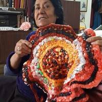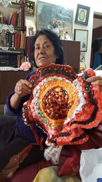 אבי היה מכין מקני סוף סלים ומגשים כמו שאני מכינה היום מניילון (מציגה לנו את אחת מהיצירות האחרונות שלה: שטיחונים הסרוגים משקיות ניילון).