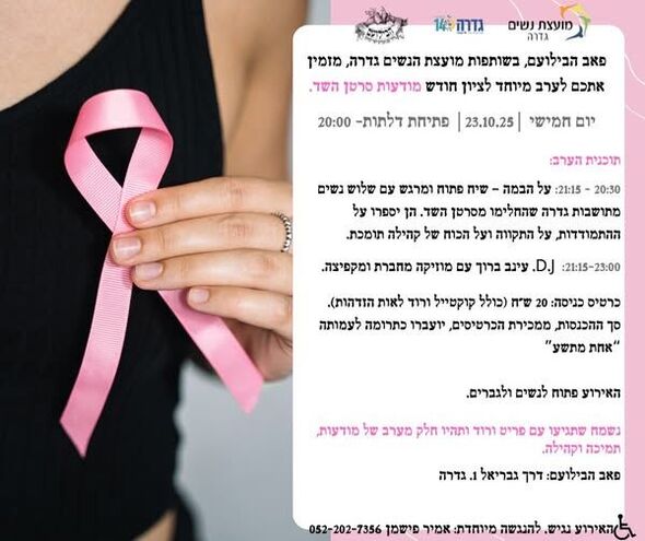פאב הבילועם ומועצת הנשים גדרה מזמינים אתכם לערב לציון חודש המודעות לסרטן השד.