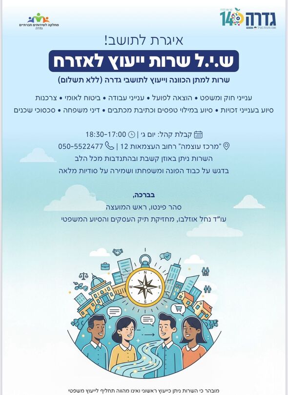 בימי שלישי פועל שירות ש.י.ל - שירות ייעוץ לאזרח במרכז עוצמה גדרה המעניק ייעוץ במגוון תחומים ללא עלות
