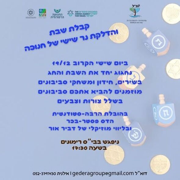 קהילת יובל גדרה מזמינה את הקהילה לקבלת שבת והדלקת נרות חנוכה
