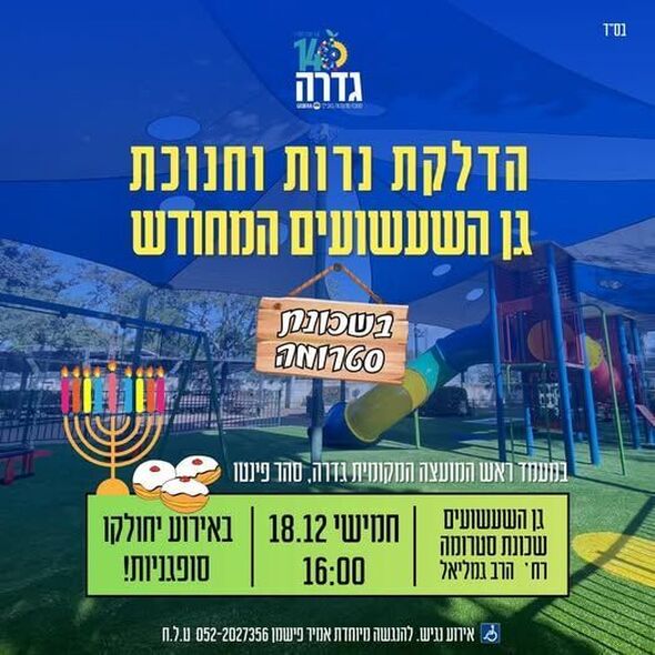 המועצה המקומית גדרה תקיים הערב (חמישי 18.12) טקס הדלקת נרות חגיגי וחנוכת גן השעשועים המחודש בשכונת סטרומה