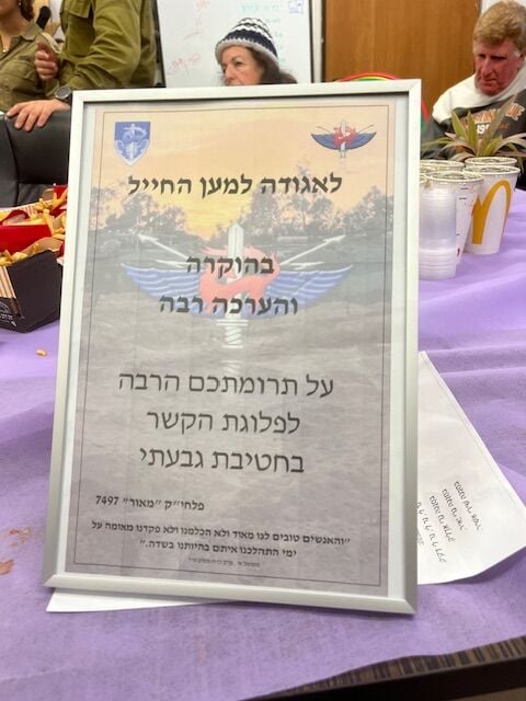 מתנדבי האגודה למען החייל בגדרה חגגו את חג החנוכה עם חיילי גבעתי שהעניקו להם תעודת הוקרה על תרומתם