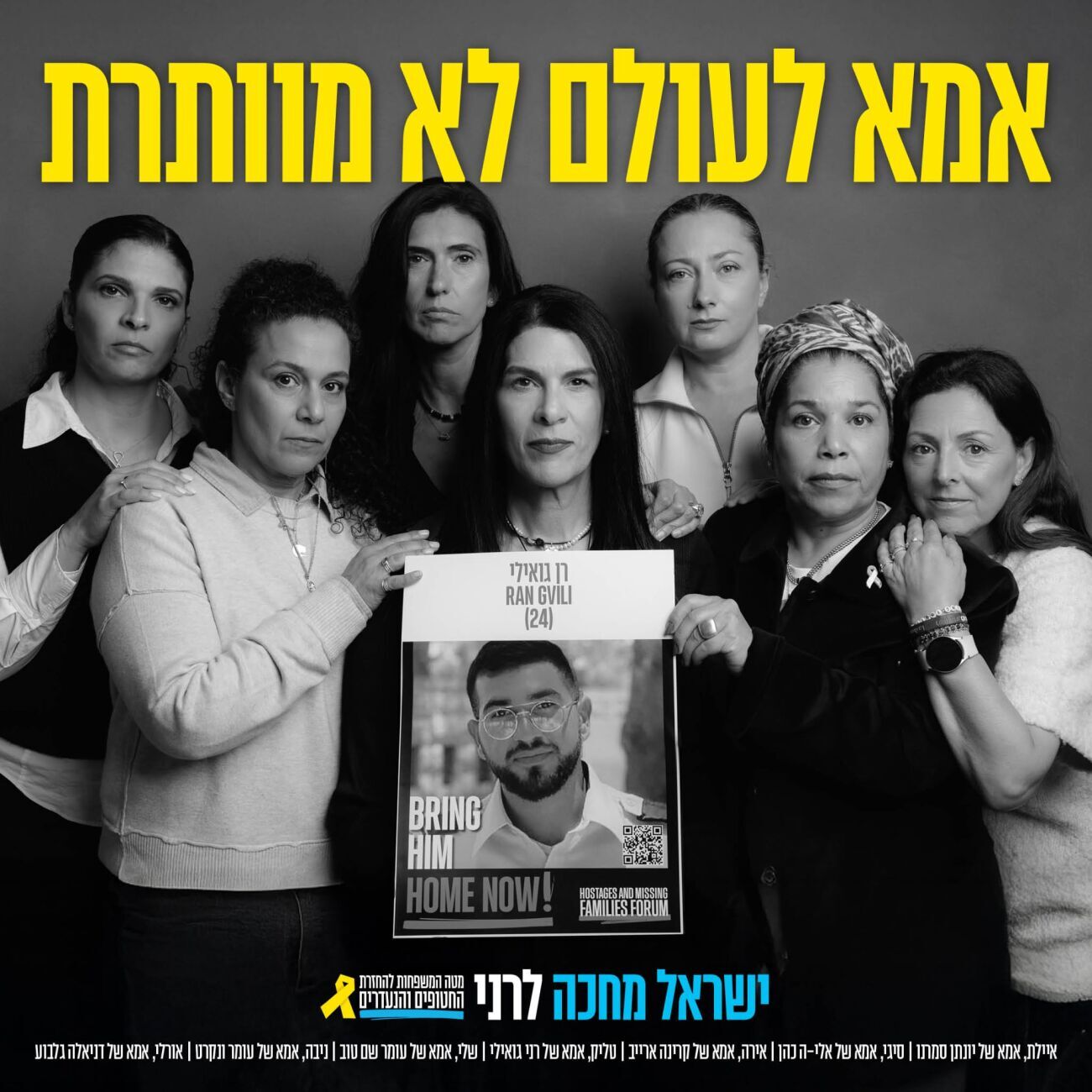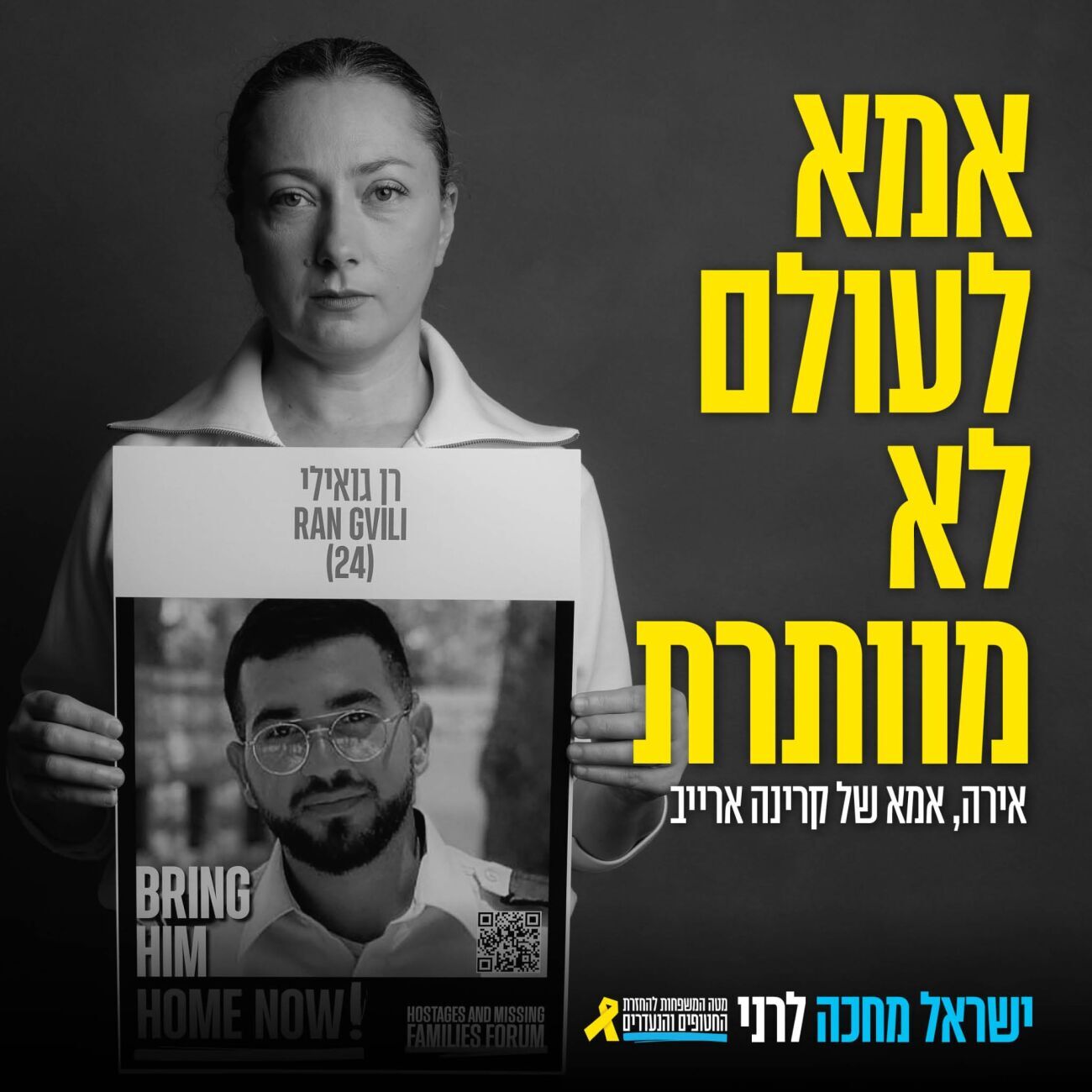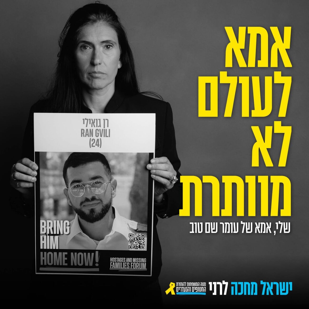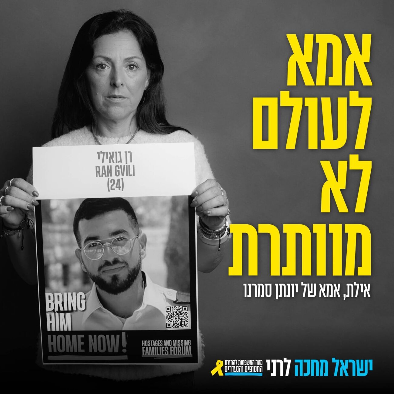 מטה המשפחות להחזרת החטופים הודיע על השקתו המחודשת של קמפיין "אמא לעולם לא מוותרת", לציון 837 ימים בהם עדיין מוחזקים חטופים בשבי, ולציון שנה לעסקה בה הושבו 33 חטופות וחטופים. הפעם, הקמפיין מוקדש כולו לרן גואילי, החטוף האחרון שנותר בשבי.