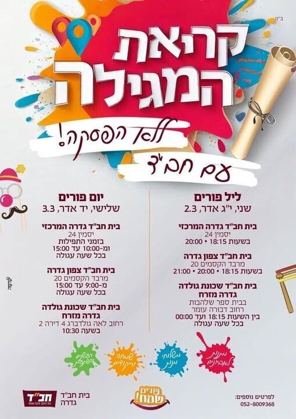 זמני ומוקדי קריאת המגילה של בית חב"ד בגדרה בחג הפורים 2-3.3