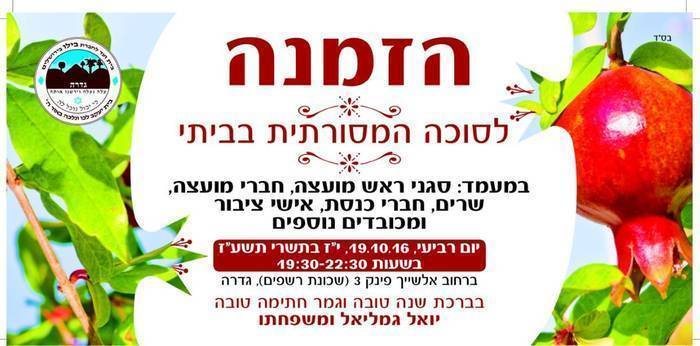ראש מועצת גדרה יואל גמליאל מזמין את הציבור לסוכת ביתו להרמת כוסית יום רביעי 19/10 שעה : 19:30