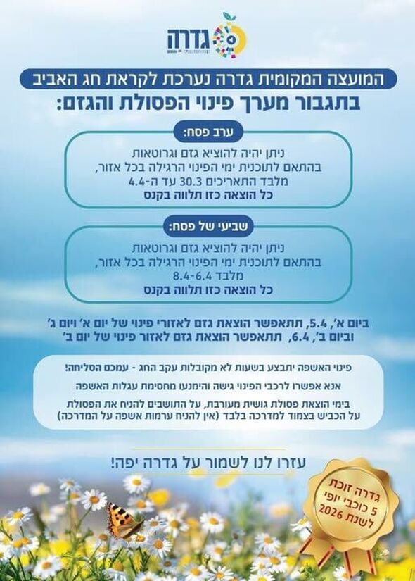 לקראת חג הפסח, המועצה המקומית גדרה נערכת לתגבור מערך פינוי הפסולת והגזם ברחבי היישוב. המועצה פרסמה הנחיות מפורטות לתושבים על מנת לשמור על החזות העירונית, זאת גם במקביל לזכייתה של המושבה בפרס חמישה כוכבי יופי לשנת 2026.