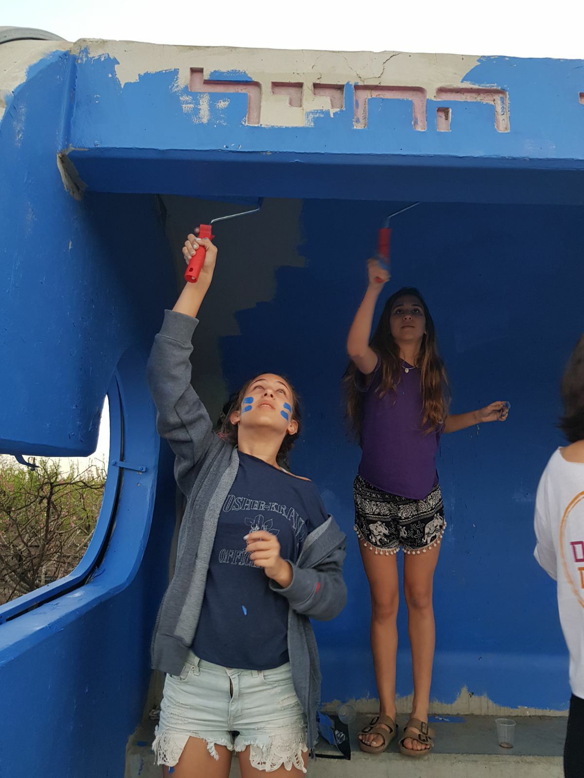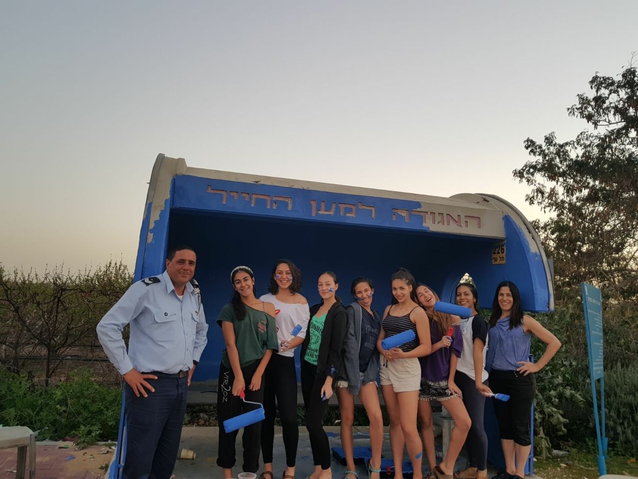 רקדניות בית הספר למחול של מרכז אופק יצאו למבצע נקיון וצביעת תחנת ההסעה של החיילים ליד תל נוף