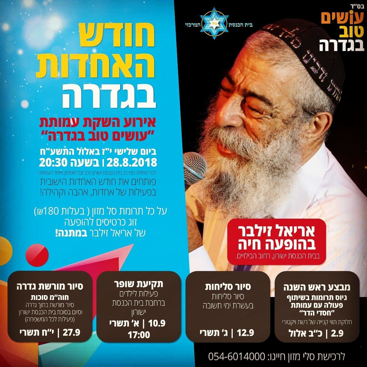 עוד נמסר מהעמותה כי בחודש האחדות היא תפעל לקיים מספר פעילויות מחברות, ביניהן, הופעתו של הזמר אריאל זילבר וסיור סליחות יישובי עם גבאי בית הכנסת הגדול "ישורון", לרבות סיפורי הקמת היישוב, סיור סליחות בירושלים בג' תשרי (12.9), אירוע תקיעת שופר לציבור החילוני ביישוב וקיום סוכה קהילתית לכל המשפחה.