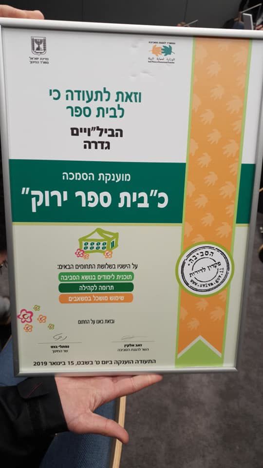 בית ספר הבילוייים בגדרה קיבל את תעודת ההסמכה לבית ספר ירוק של המשרד לאיכות הסביבה ומשרד החינוך