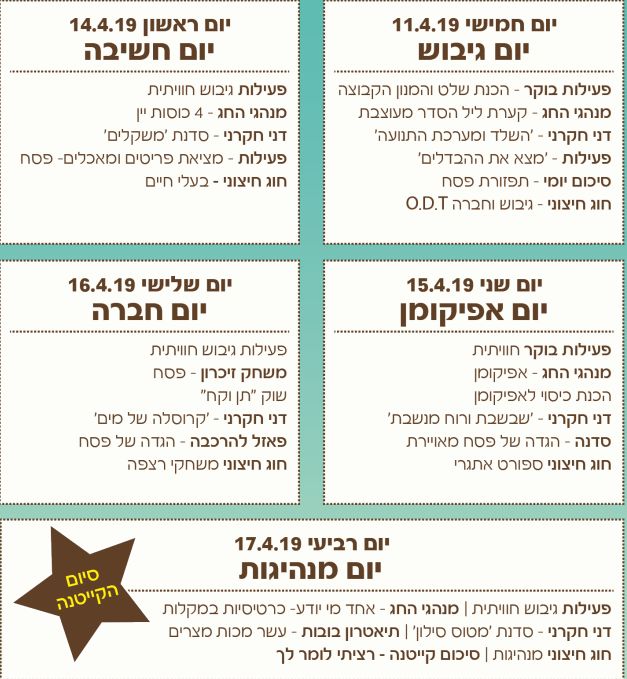 הקייטנה תפעל בימים חמישי 11.4- רביעי 17.4 – ללא יום שישי.