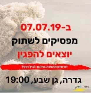 בגדרה ההפגנה תתקיים ביום ראשון 7/7 בשעה 19:00 בגן שבע