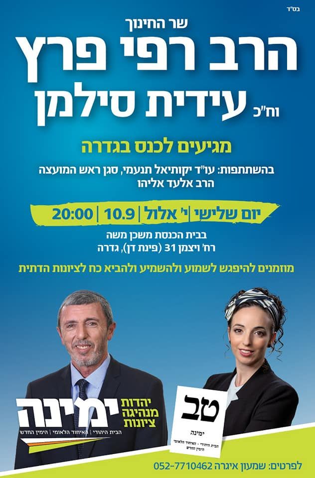 בחירות 2019! שר החינוך, הרב רפי פרץ וח"כ עידית סילמן מגיעים ביום שלישי 10/9 לכנס בגדרה