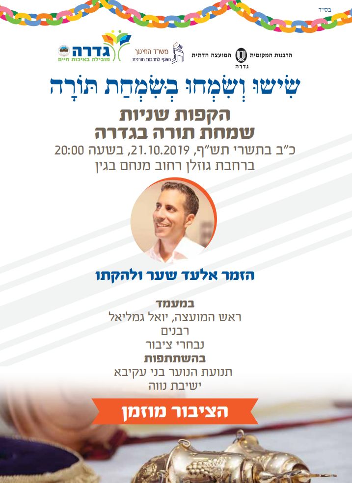 המועצה המקומית גדרה מזמינה את התושבים לאירועי חג הסוכות שיתקיימו ברחבי המושבה. בין האירועים הופעה לנוער של חן מזרחי, סגיב כהן ועוד.