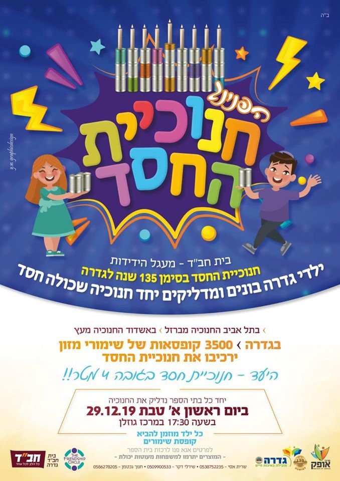 פעילות נוספת שמתקיימת היא של בית חב"ד בגדרה שתערוך במהלך החג את חנוכיית החסד -חנוכייה הבנוייה כולה משימורים שייתרמו למשפחות מעוטות יכולת. השימורים יאספו מתלמידי בתי הספר בגדרה. לפרטים נוספים יש לפנות לרכזות בתי הספר.