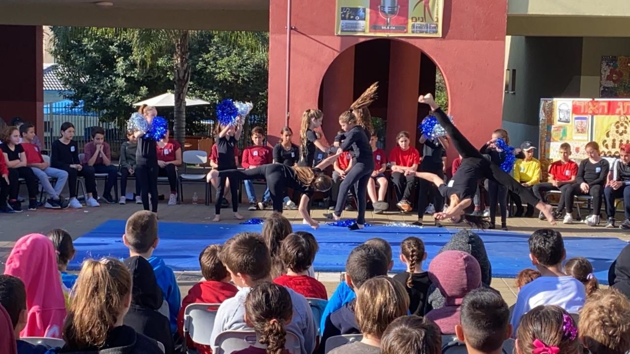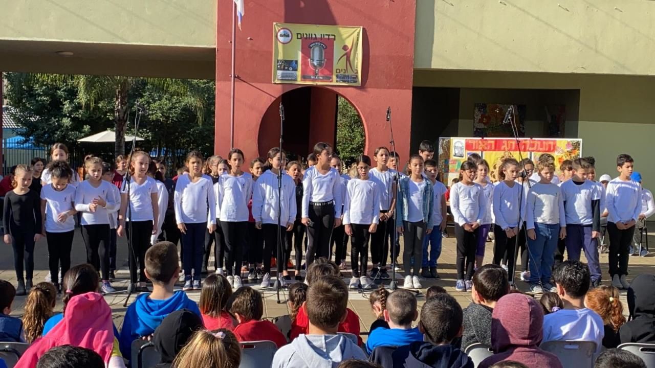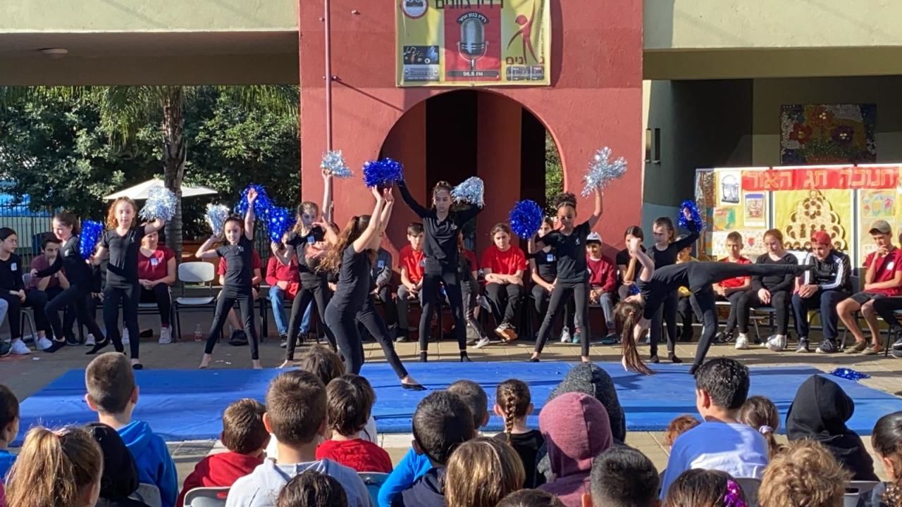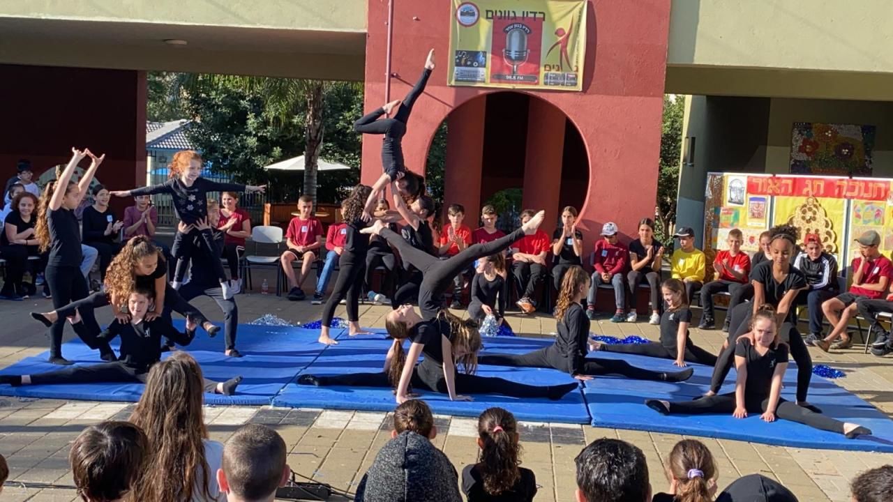נבחרת התעמלות הקרקע הבית ספרית במופע מרהיב בהדרכת המורות לחינוך גופני שירן ומיכל, לצד שירתם של תלמידי המקהלה הבית ספרית בניצוחו של המורה ערן גלאי.
