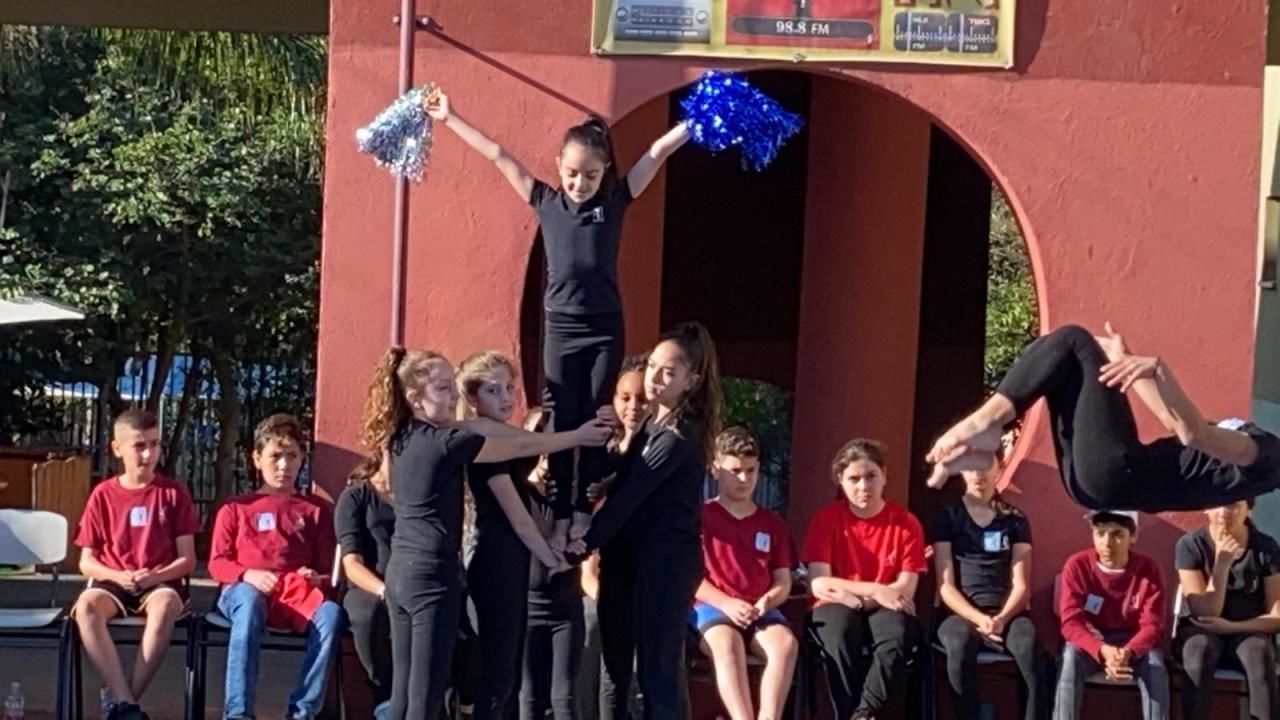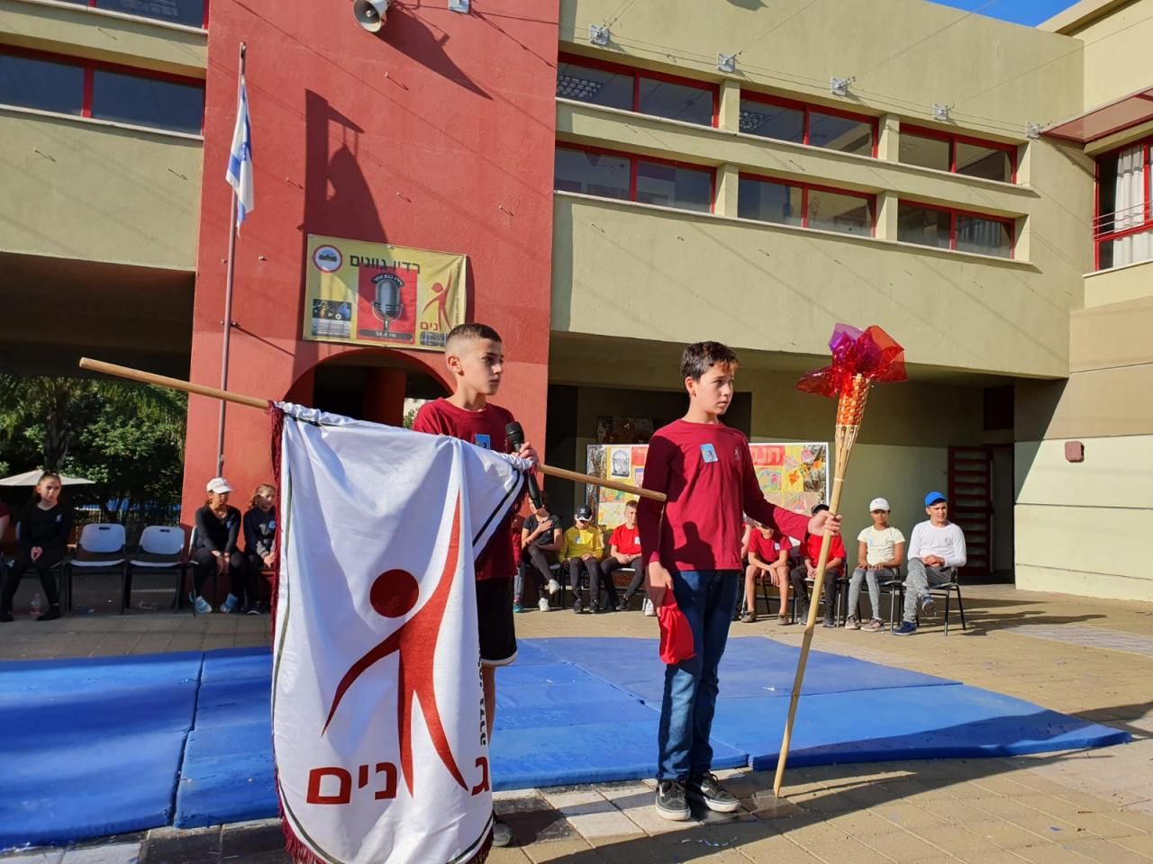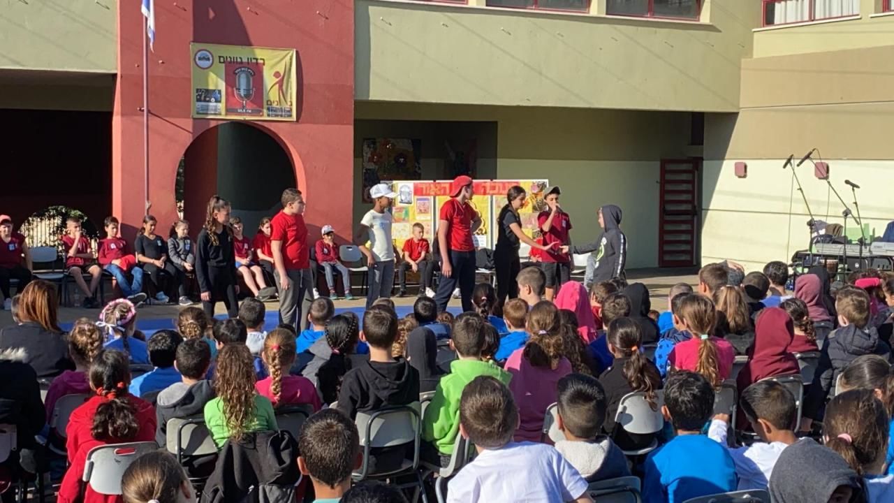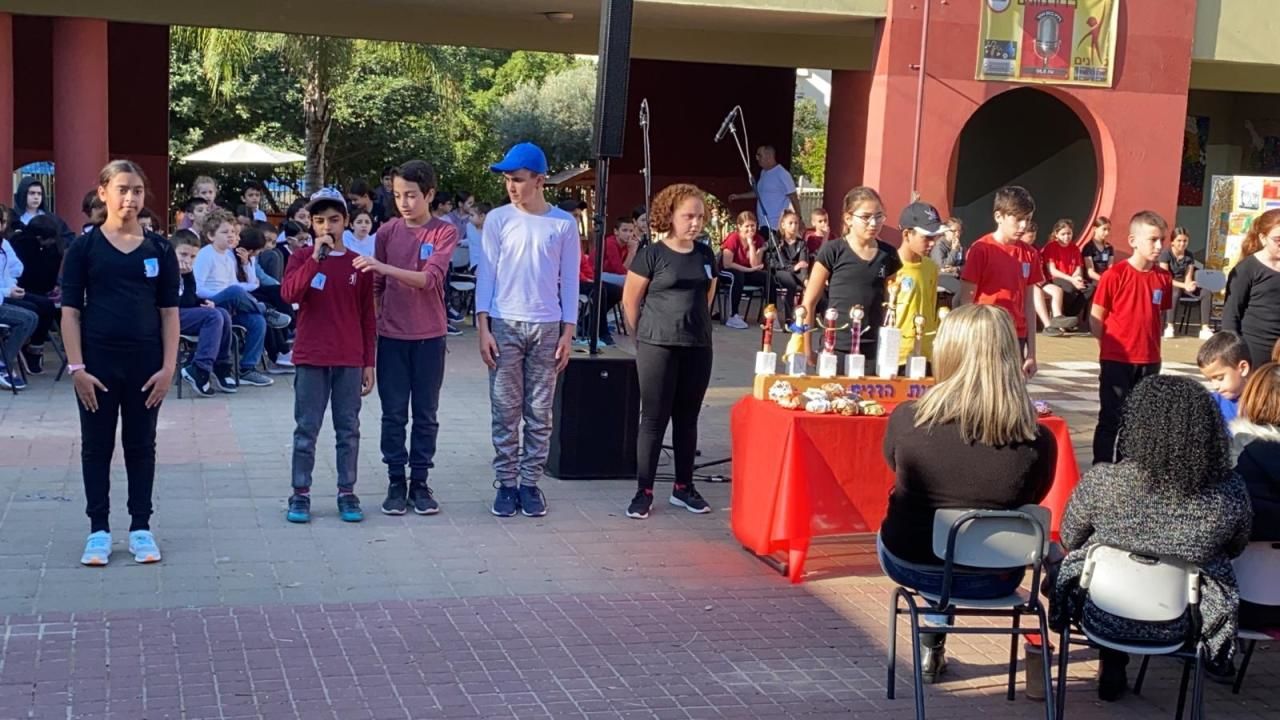 נבחרת התעמלות הקרקע הבית ספרית במופע מרהיב בהדרכת המורות לחינוך גופני שירן ומיכל, לצד שירתם של תלמידי המקהלה הבית ספרית בניצוחו של המורה ערן גלאי.