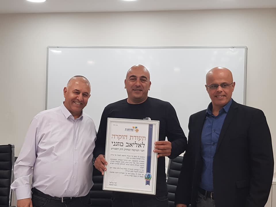יואל גמליאל העניק תעודת הוקרה לאליאב מזגני, מחזיק תיק הספורט ואורלי כהן, מנהלת מחלקת הספורט על פעילותם להצלחת מירוץ גדרה ה3