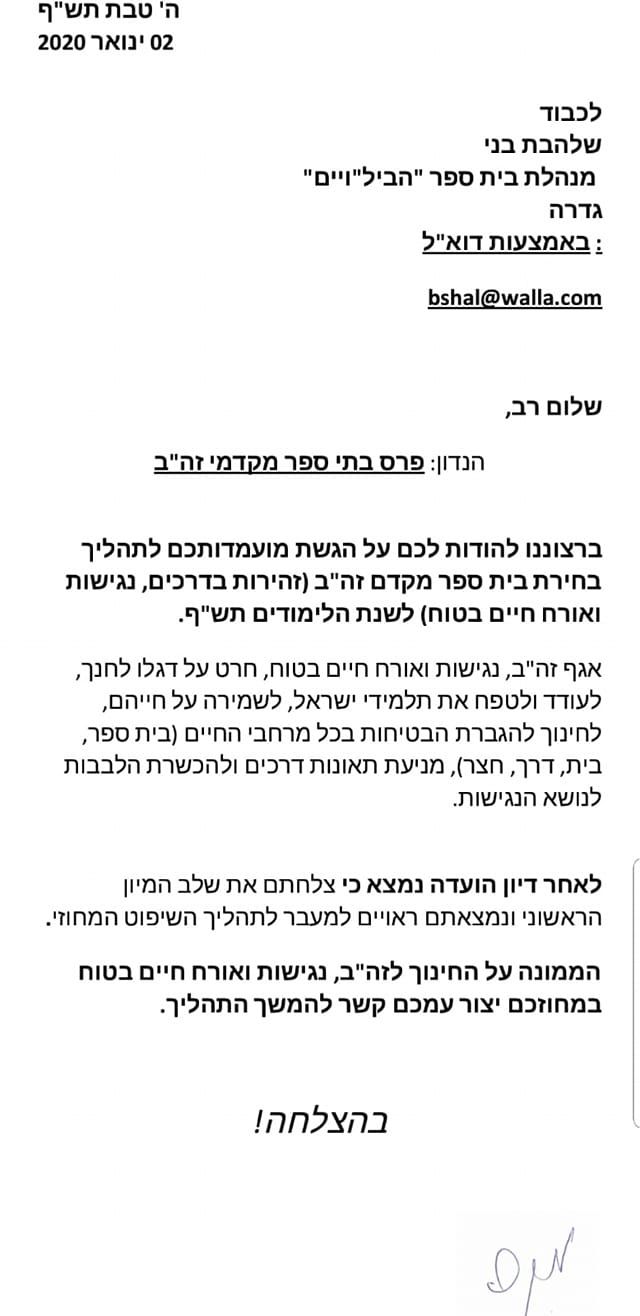 בית ספר הבילויים בגדרה העפיל לשלב המחוזי של פרס בתי הספר מקדמי זהירות בדרכים (זה"ב) של משרד החינוך