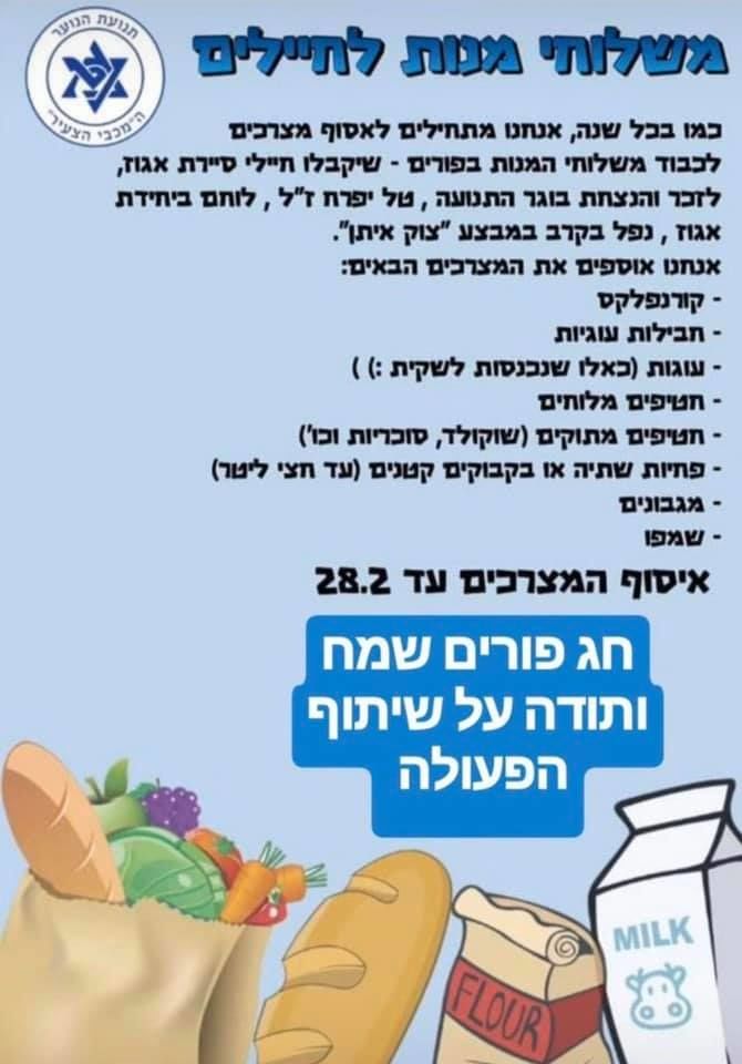 כמדי שנה תנועת מכבי צעיר גדרה החלה במבצע הכנת משלוחי מנות לחיילי צה"ל